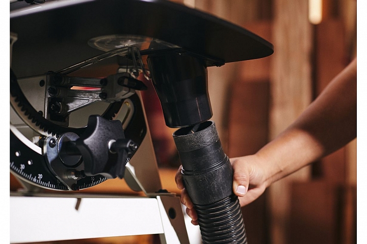 Для сдува опилок с разметки предусмотрен регулируемый воздуховод и помпа, для пылеотсоса патрубок и набор отверстий в столе.