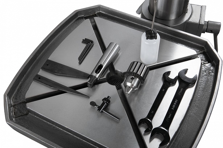 Редуктор шести ступенчатой коробки скоростей с частотами вращения шпинделя 75, 170, 280, 540, 960,1600 об/мин и автоматическая подача пиноли шпинделя со скоростями 0,1 / 0,18 / 0,26 мм/об позволяют обрабатывать различные виды отверстий на корректных режимах резания с использованием инструмента из быстрорежущих сталей и твердых сплавов.